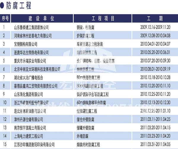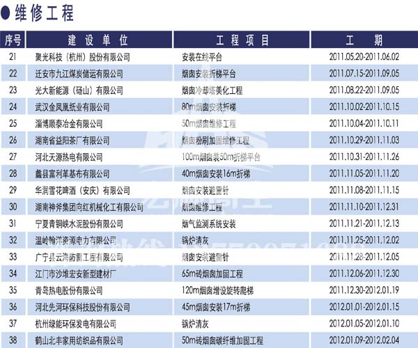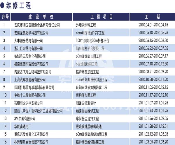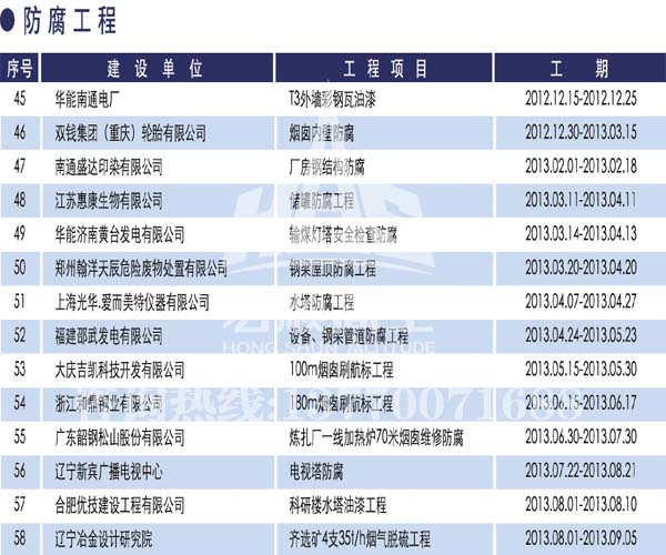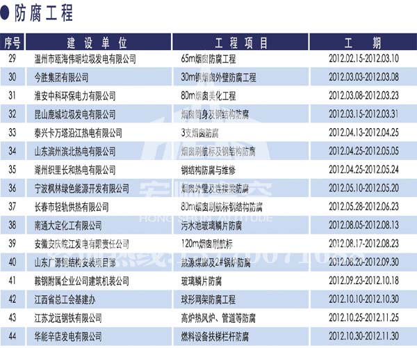 宏順建設工程有限公司是國家批準成立的專業(yè)高空作業(yè)企業(yè):承攬過(國內.國外)煙囪新建、煙囪防腐、吊機防腐、水塔防腐、管道防腐、龍門吊防腐、儲存罐防腐、煙囪內壁防腐等高空作業(yè)工程。具有“不搭腳手架 、 不需要停產(chǎn)”施工特點。